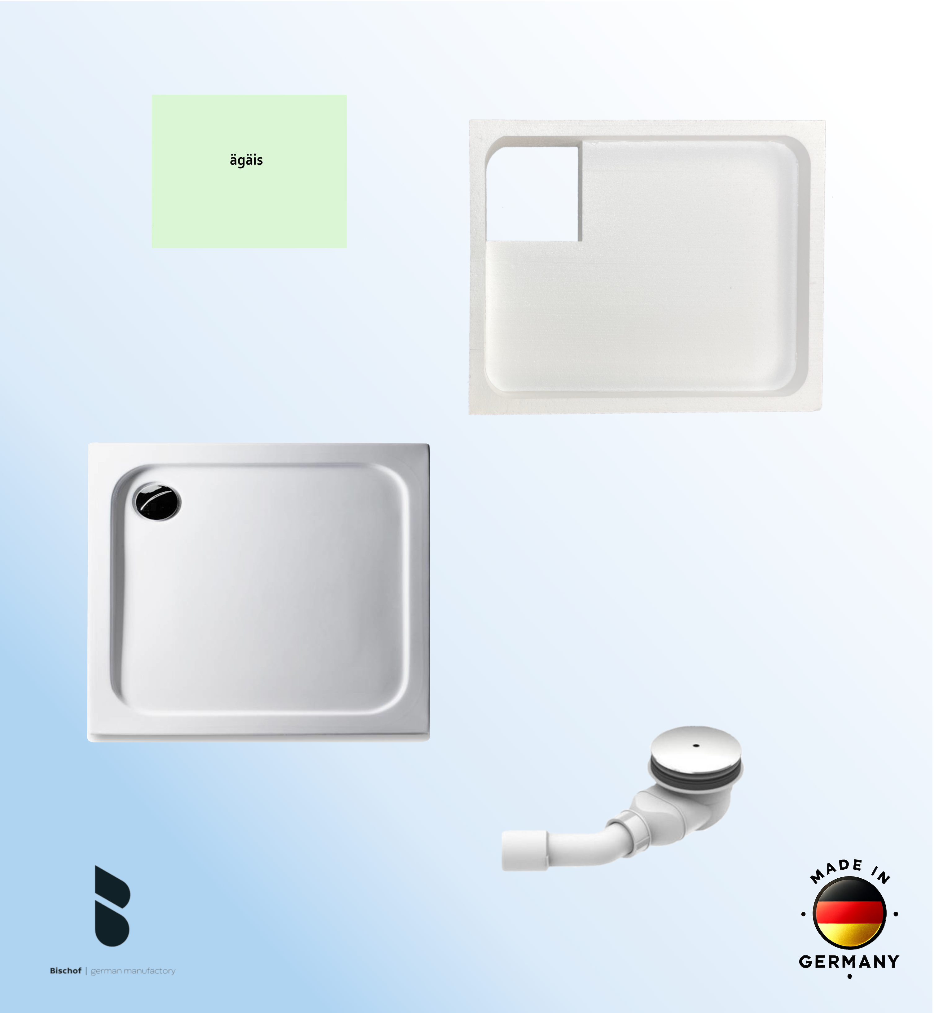 KOMPLETT-PAKET: Duschwanne 80 x 70 cm Farbe: ÄGÄIS superflach 2,5 cm Acryl + Styroporträger/Wannenträger + Ablaufgarnitur chrom DN 90