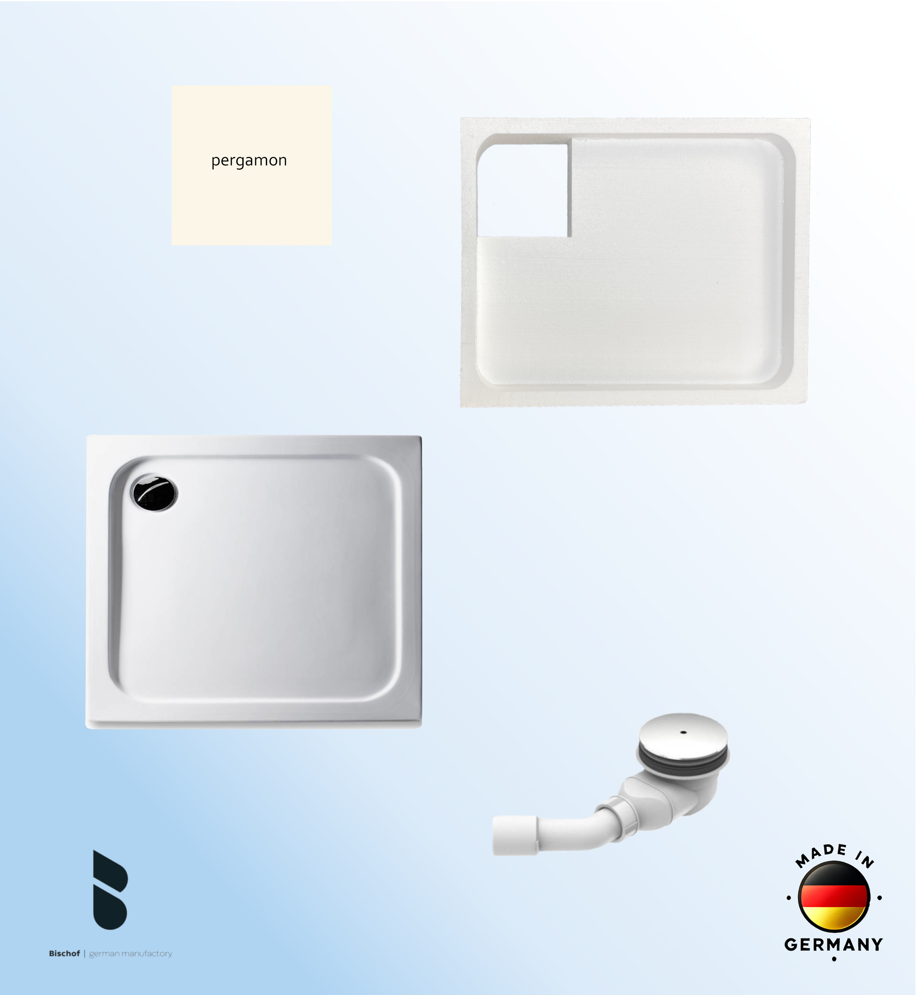 KOMPLETT-PAKET: Duschwanne 80 x 70 cm Farbe: PERGAMON superflach 2,5 cm Acryl + Styroporträger/Wannenträger + Ablaufgarnitur chrom DN 90