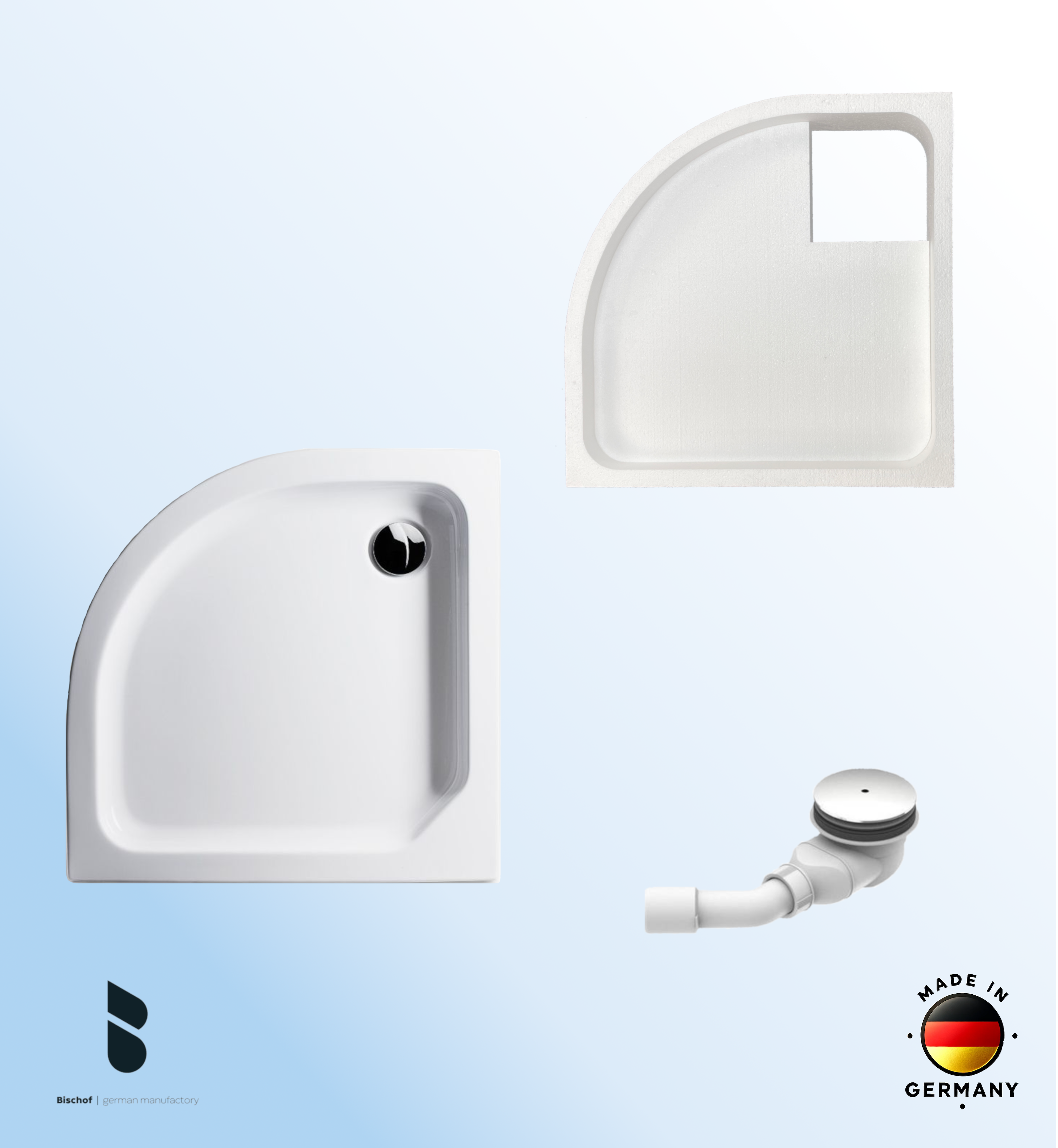Product information "KOMPLETT-PAKET: Duschwanne 80 x 80 cm Viertelkreis Radius 50, flach 6,5 cm weiß Acryl + Styroporträger/Wannenträger + Ablaufgarnitur chrom DN 90"