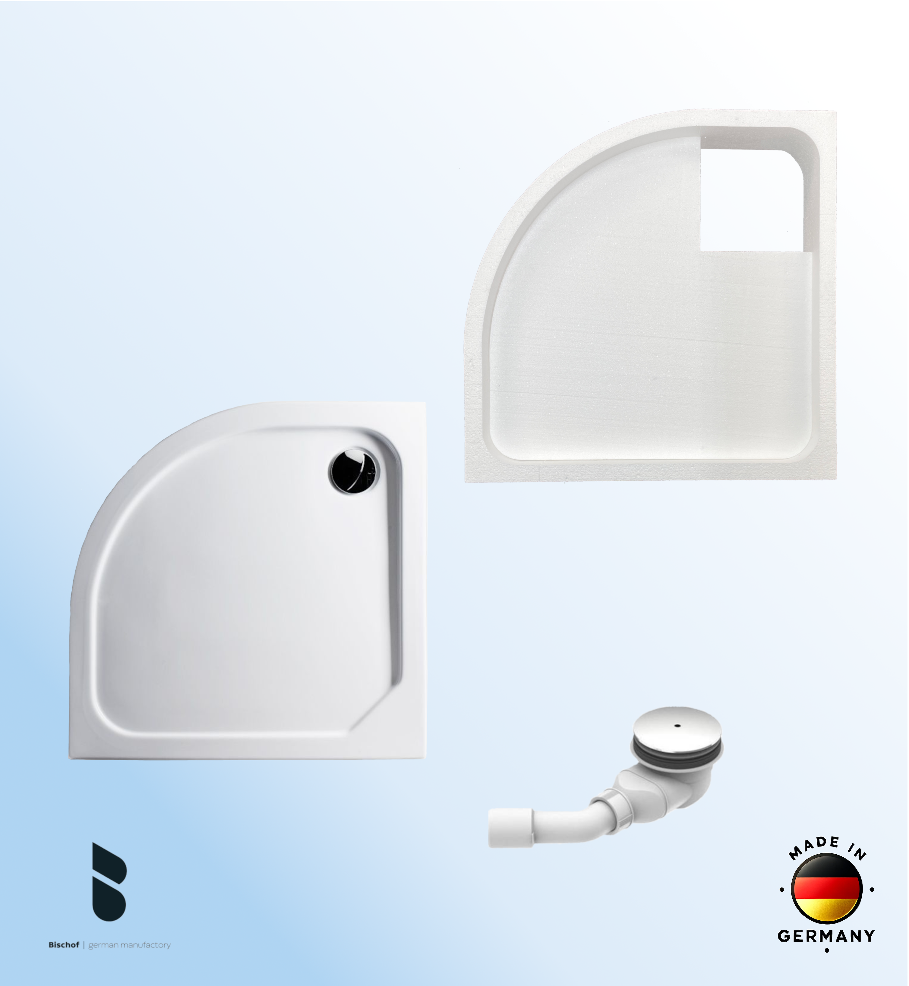 KOMPLETT-PAKET: Duschwanne 80 x 80 cm Viertelkreis Radius 50, superflach 2,5 cm weiß Acryl + Styroporträger/Wannenträger + Ablaufgarnitur chrom DN 90
