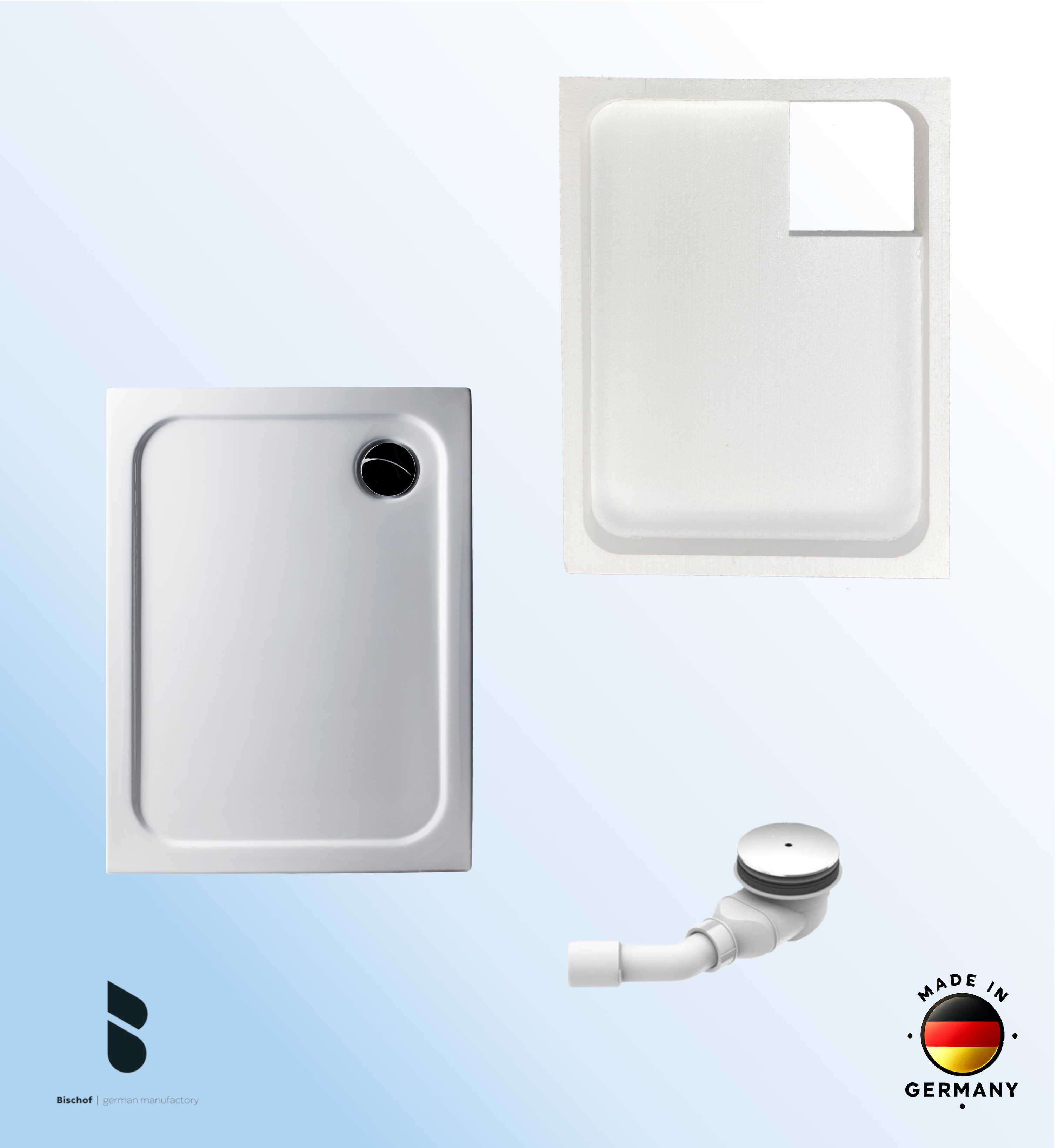 KOMPLETT-PAKET: Duschwanne 90 x 75 cm superflach 2,5 cm weiß Acryl + Styroporträger/Wannenträger + Ablaufgarnitur chrom DN 90