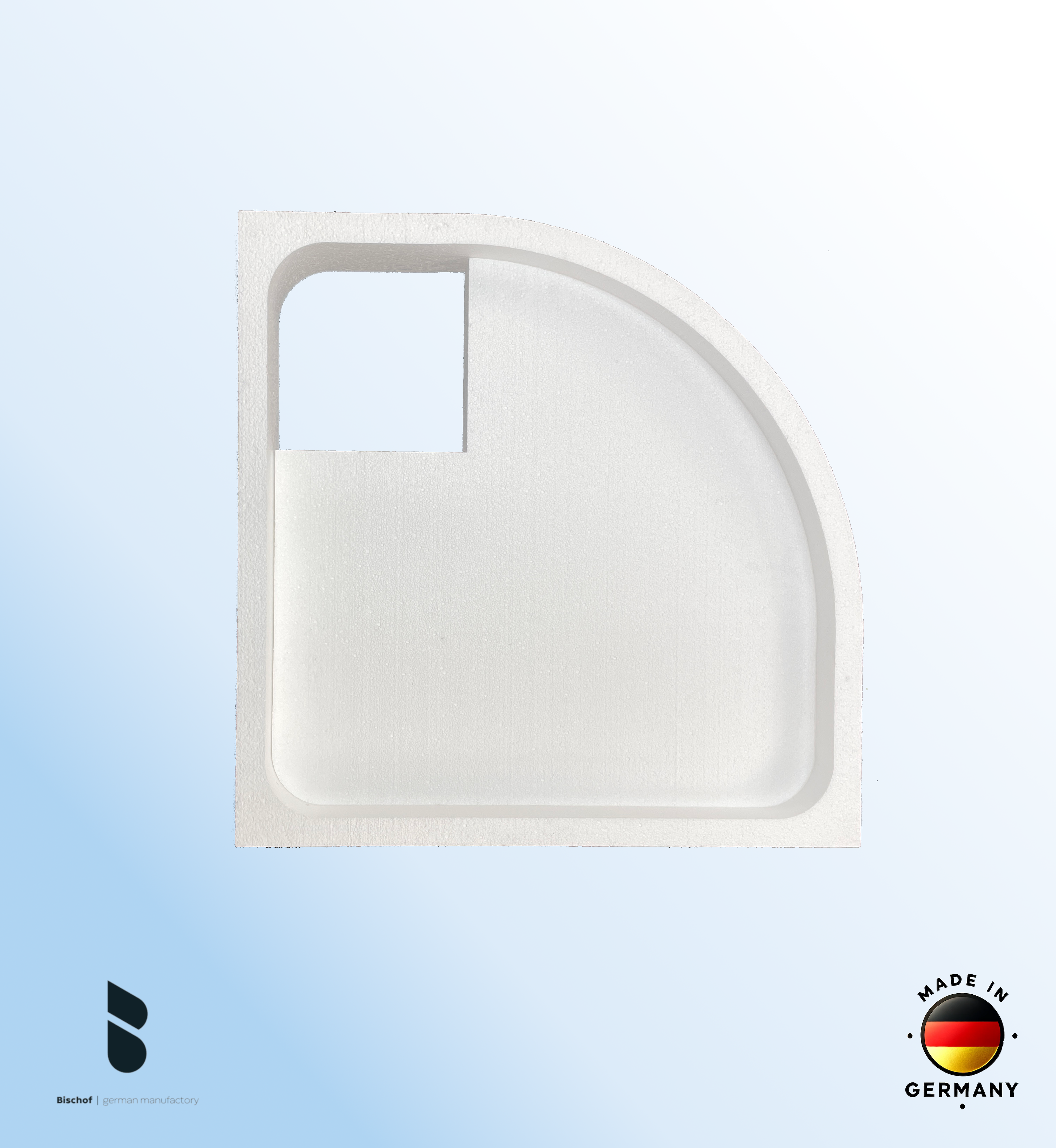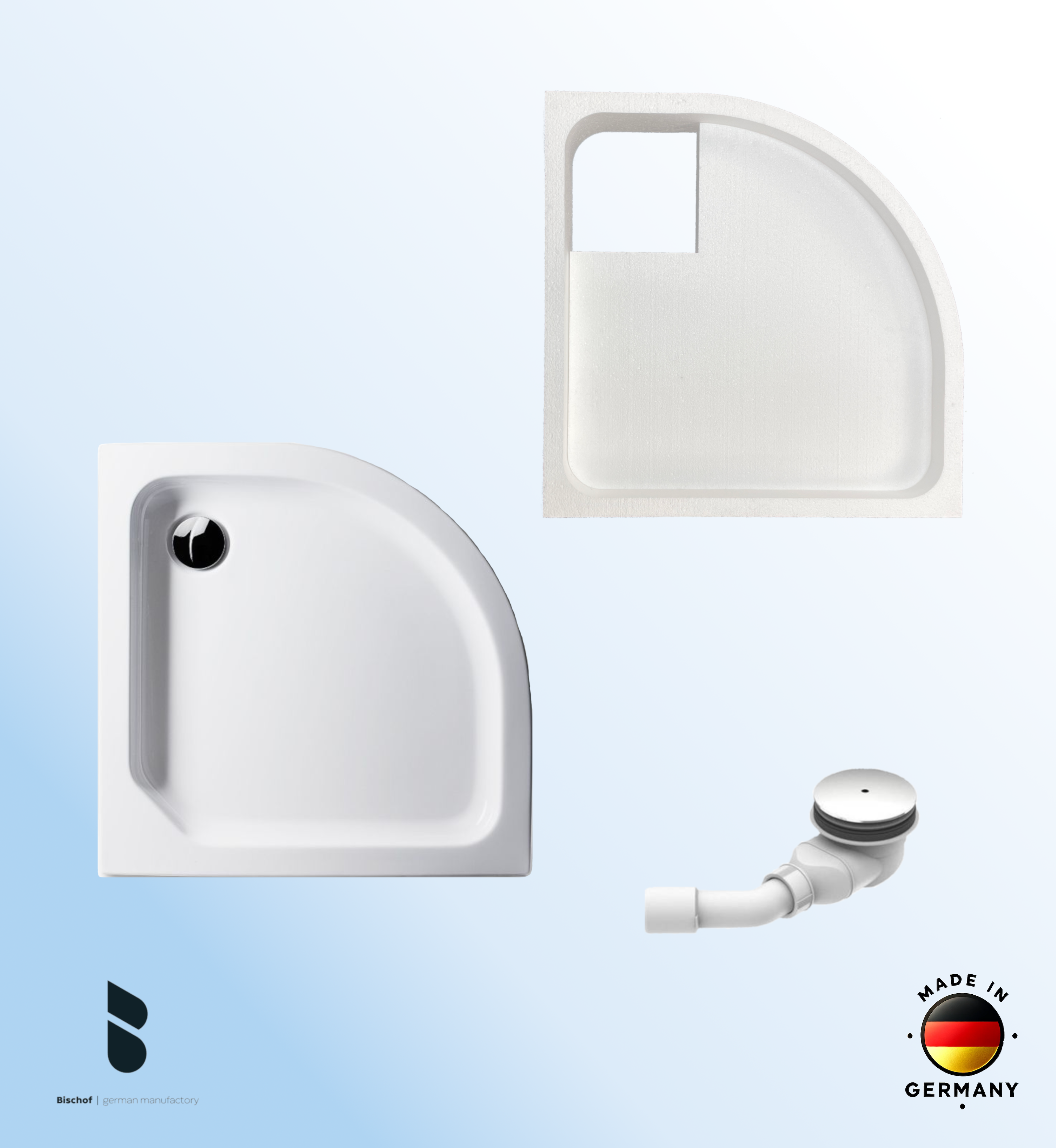 KOMPLETT-PAKET: Duschwanne 90 x 90 cm Viertelkreis Radius 55, flach 6,5 cm weiß Acryl + Styroporträger/Wannenträger + Ablaufgarnitur chrom DN 90