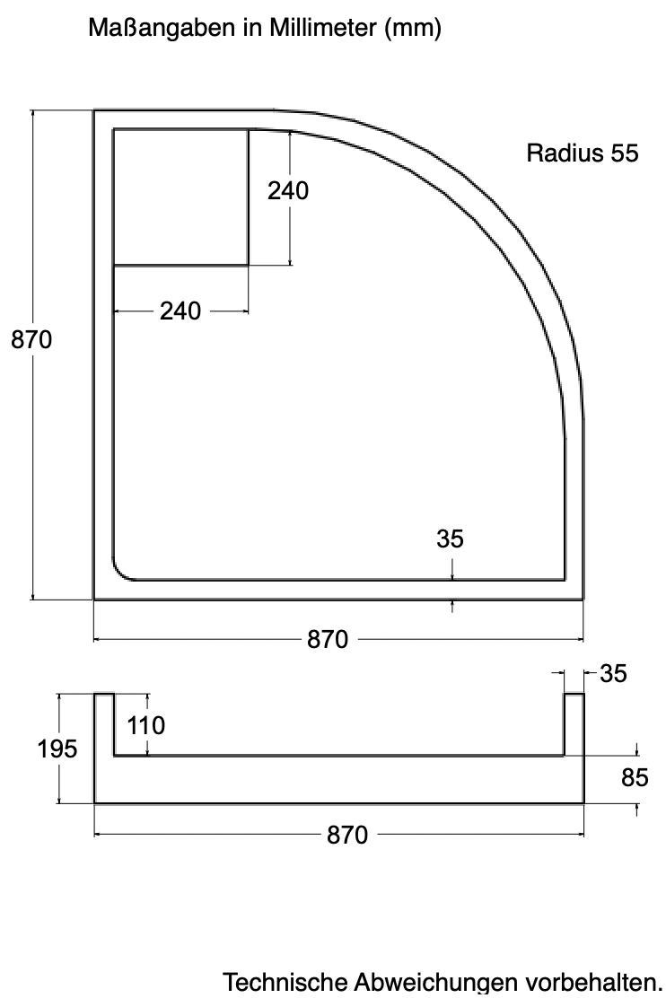- für Viertelkreis-Duschwannen, Radius wählbar (R50 oder R55)