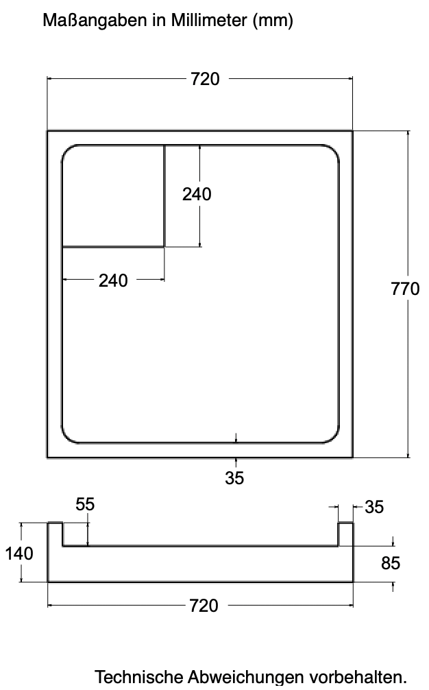 - Ablaufloch wie abgebildet (kann aber nach Kundenwunsch geändert werden)